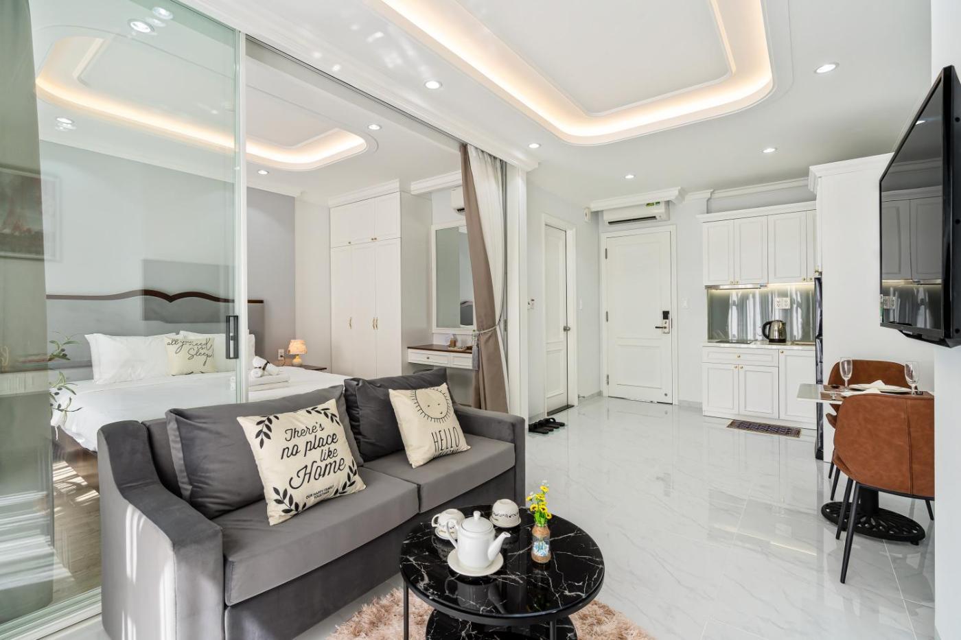One-Bedroom Apartment with Balcony. This apartment comprises 1 living room, 1 separate bedroom and 1 bathroom with a walk-in shower and free toiletries. The apartments kitchen, which features a refrigerator and a microwave, is available for cooking and storing food. The air-conditioned apartment provides a flat-screen TV, soundproof walls, a wardrobe, an electric kettle as well as a quiet street view. The unit offers 1 bed.